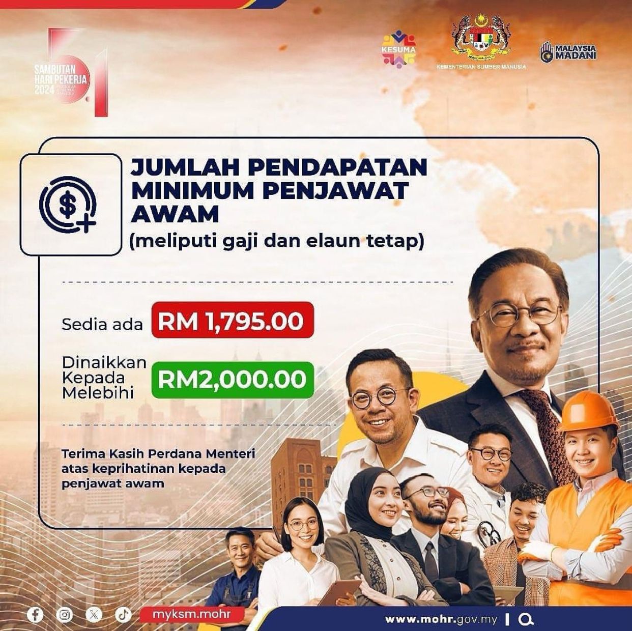 Kenaikan Gaji Penjawat Awam 2024 15%. Perdana menteri malaysia, datuk seri anwar ibrahim, mengumumkan kenaikan gaji penjawat awam sebanyak 15% pada 2024. Naik 15%, ini simulasi fasa 1 & 2 kenaikan gaji penjawat awam bermula disember nanti.